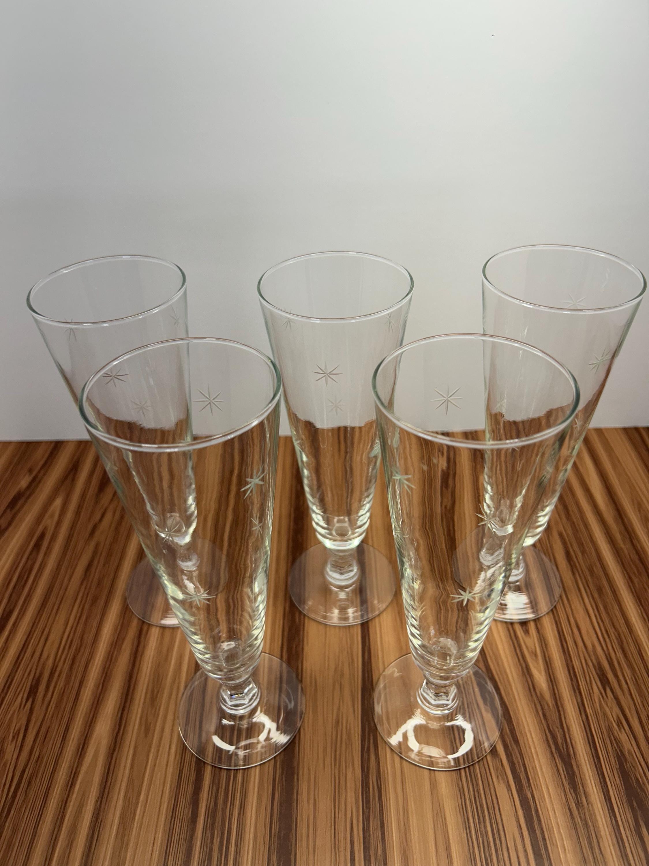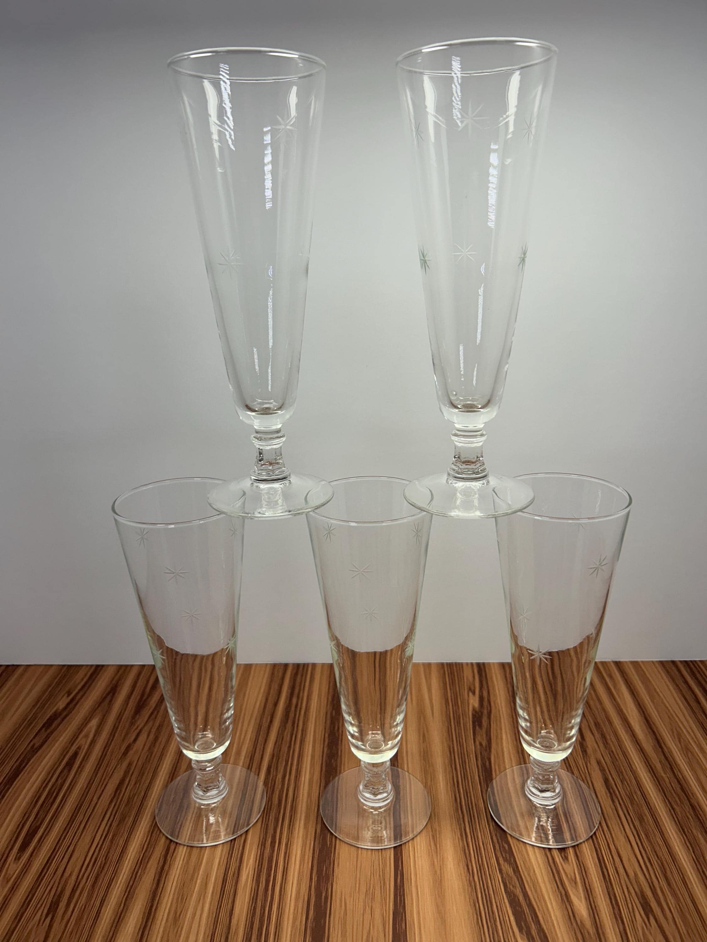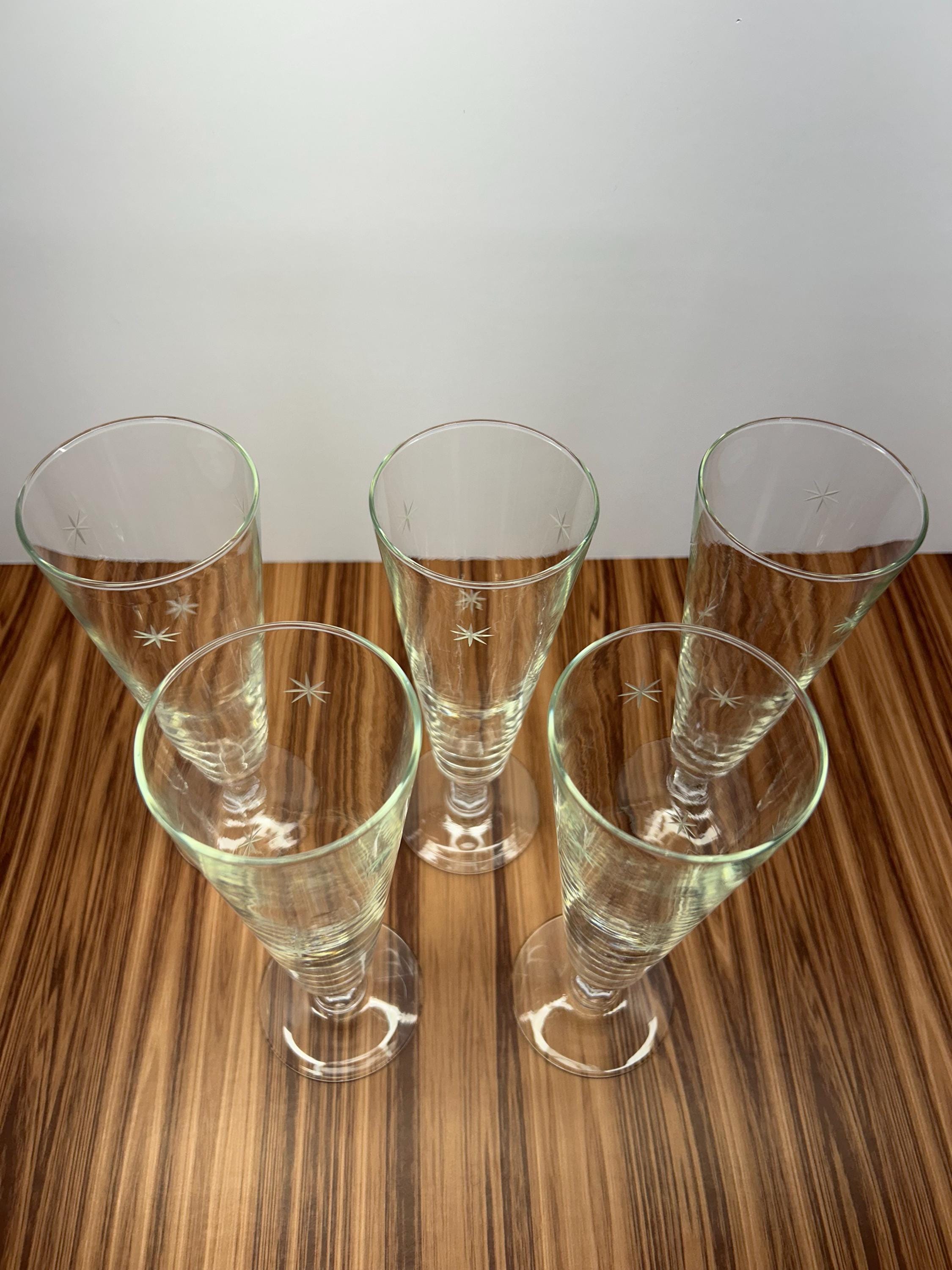 Add a touch of mid-century charm to your home bar or table with this set of five Quartex Stardust pilsner glasses, made in the 1950s. Each glass features the iconic sparkling “stardust” flecked pattern that gives it a subtle shimmer and timeless retro appeal.