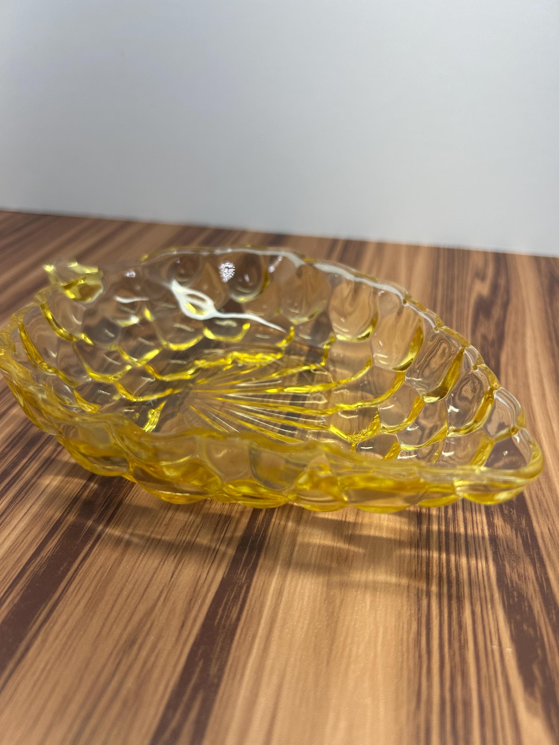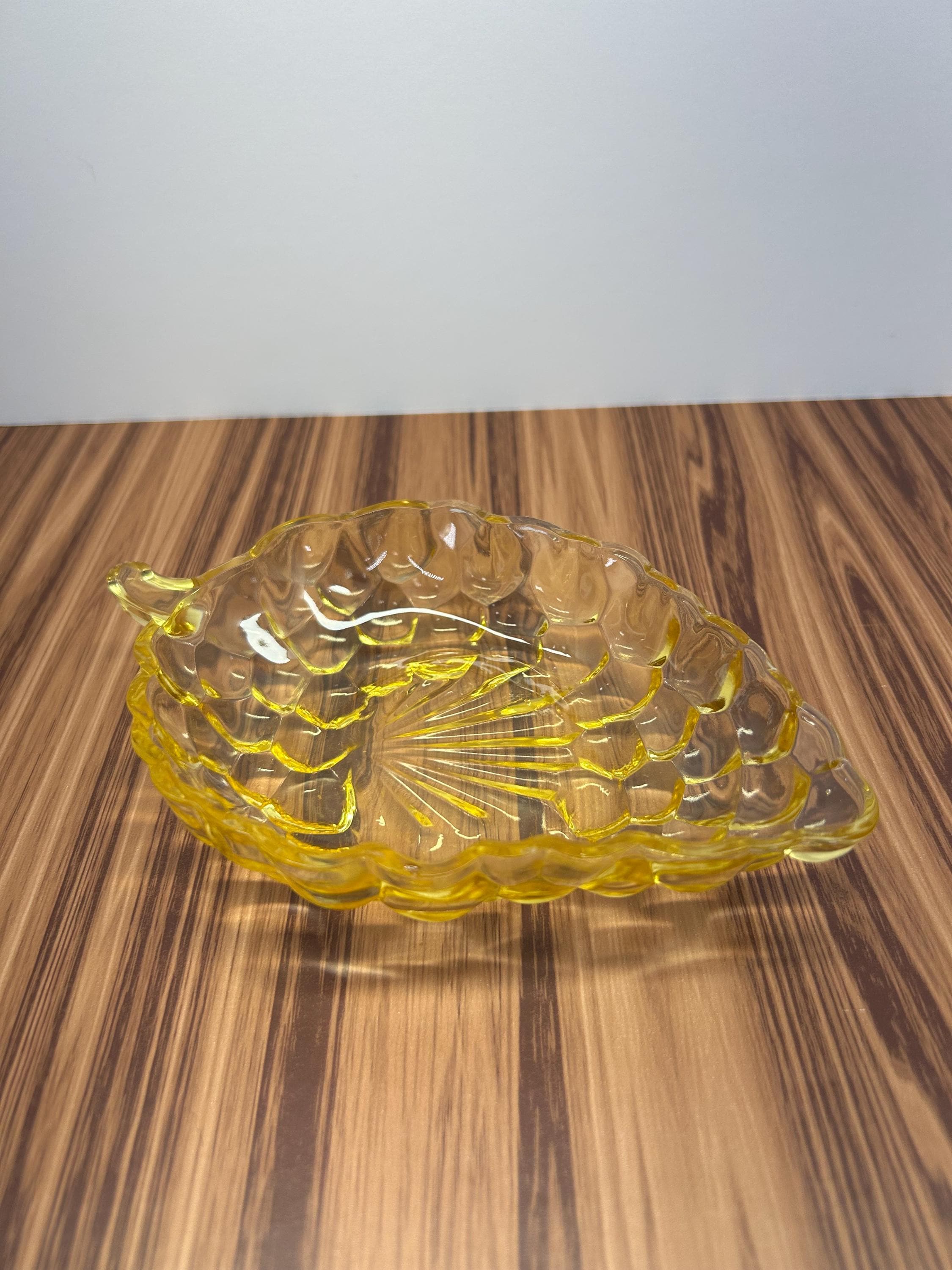 Add a cheerful touch of mid-century charm to your table or collection with this vintage Anchor Hocking amber glass grape shaped dish from 1942. Its vibrant sunny color and classic design make it perfect for serving, display, or as a collectible piece of retro glassware.