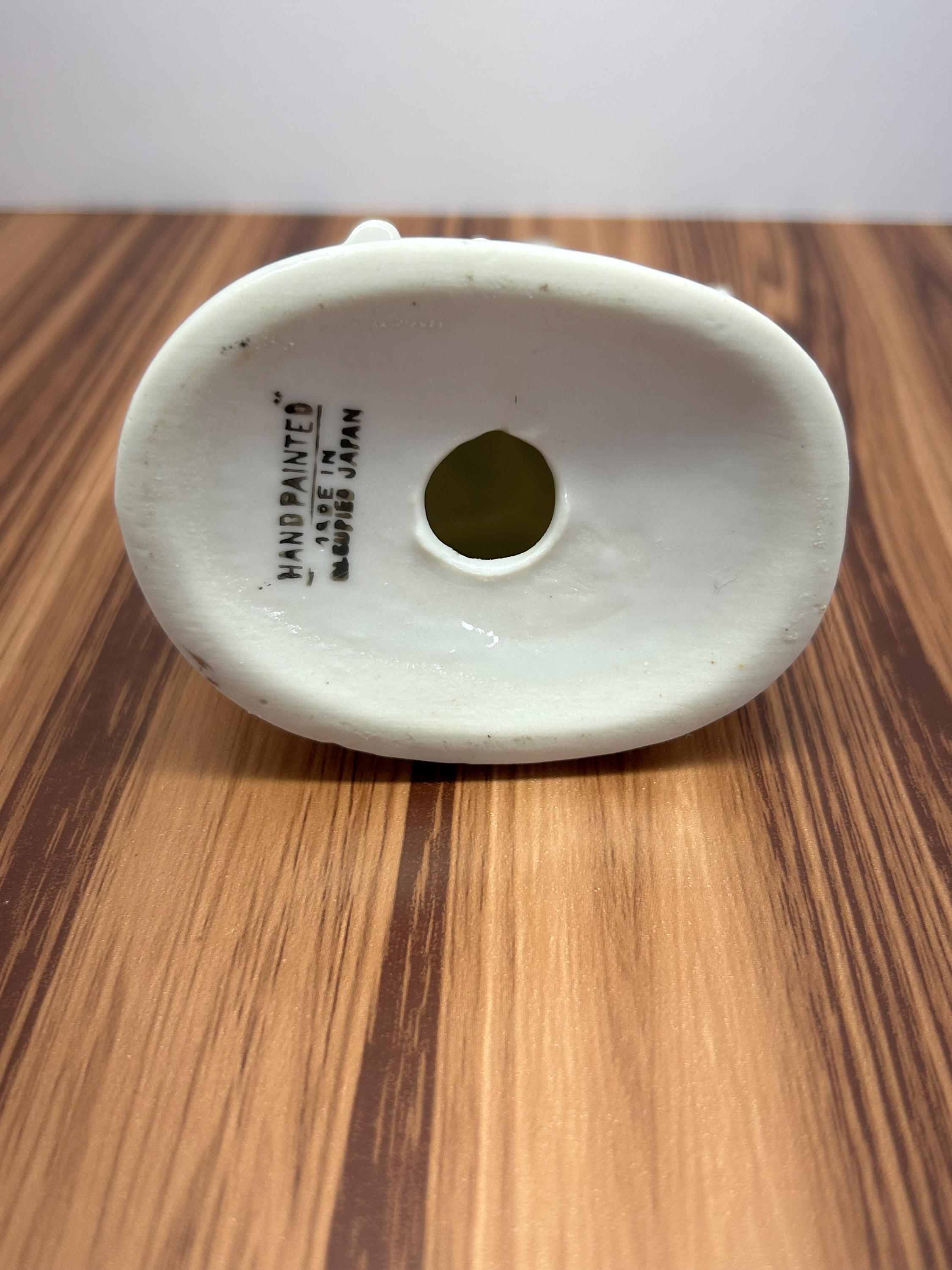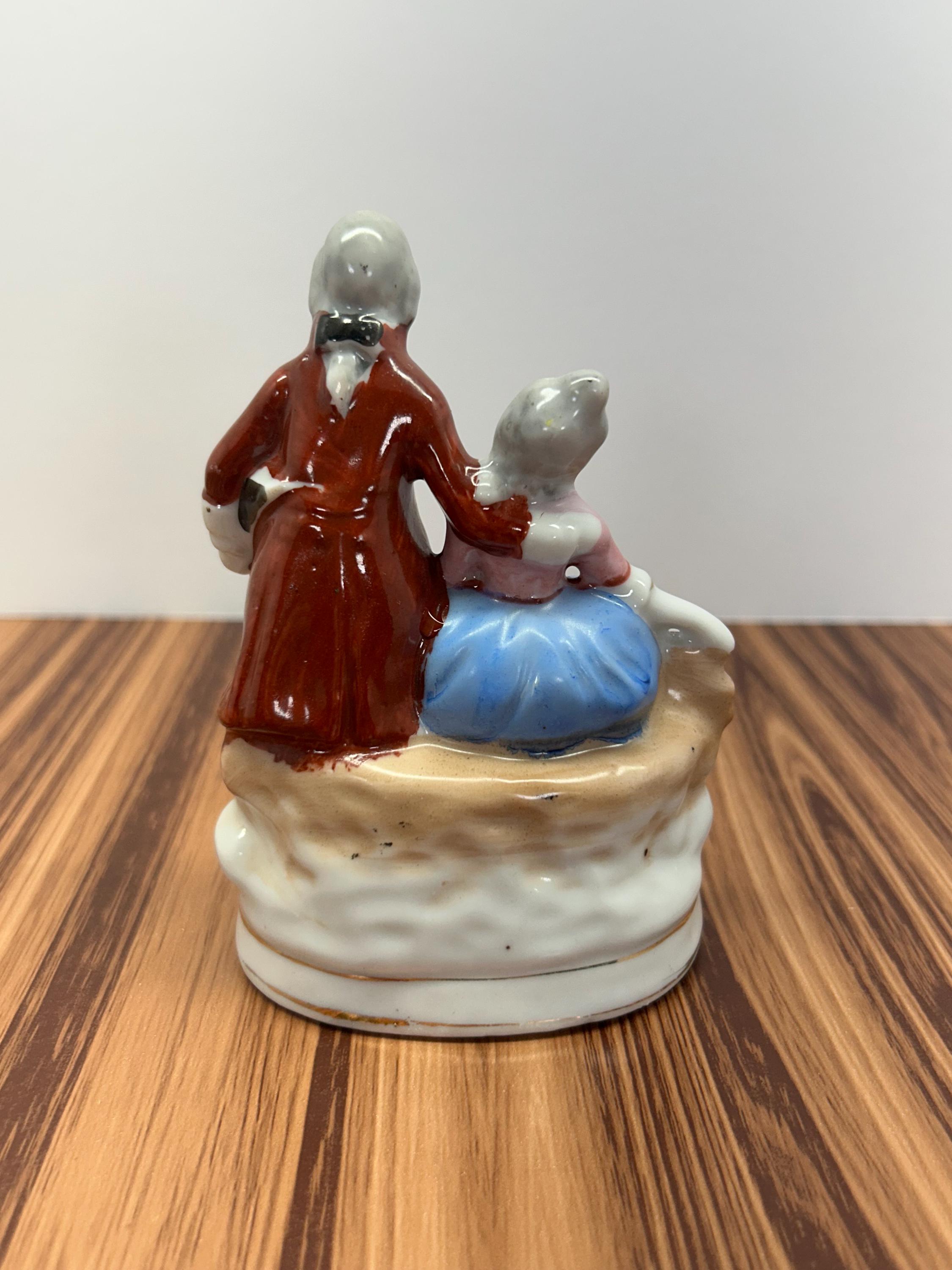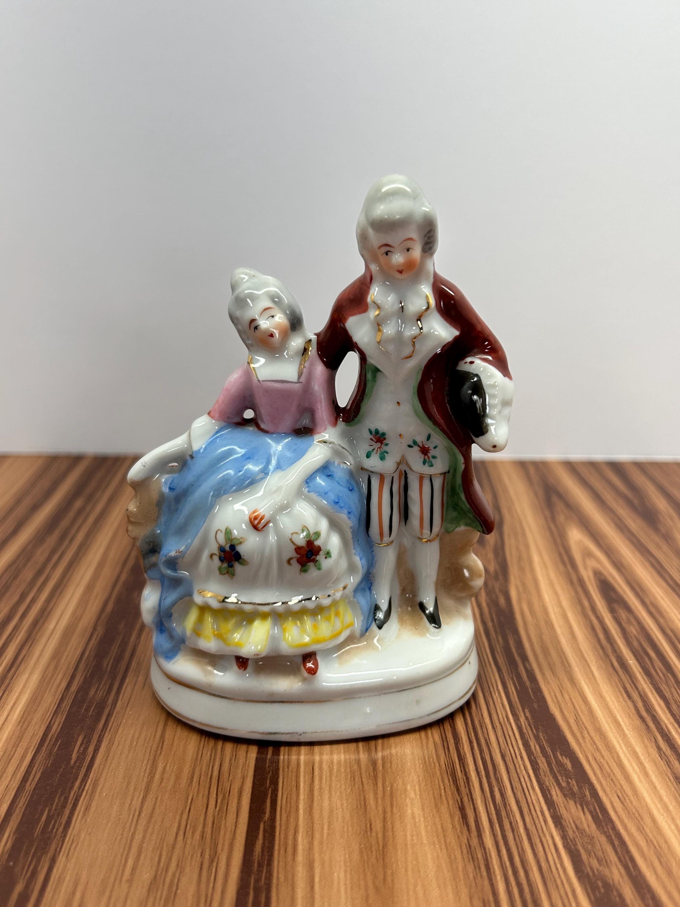Hand-painted porcelain figurine depicting a Victorian-era couple, dated circa 1945. Beautifully detailed with period attire and soft hand-applied colors, this piece reflects classic post-war craftsmanship and romantic Victorian styling. A lovely addition to any porcelain or figurine collection.