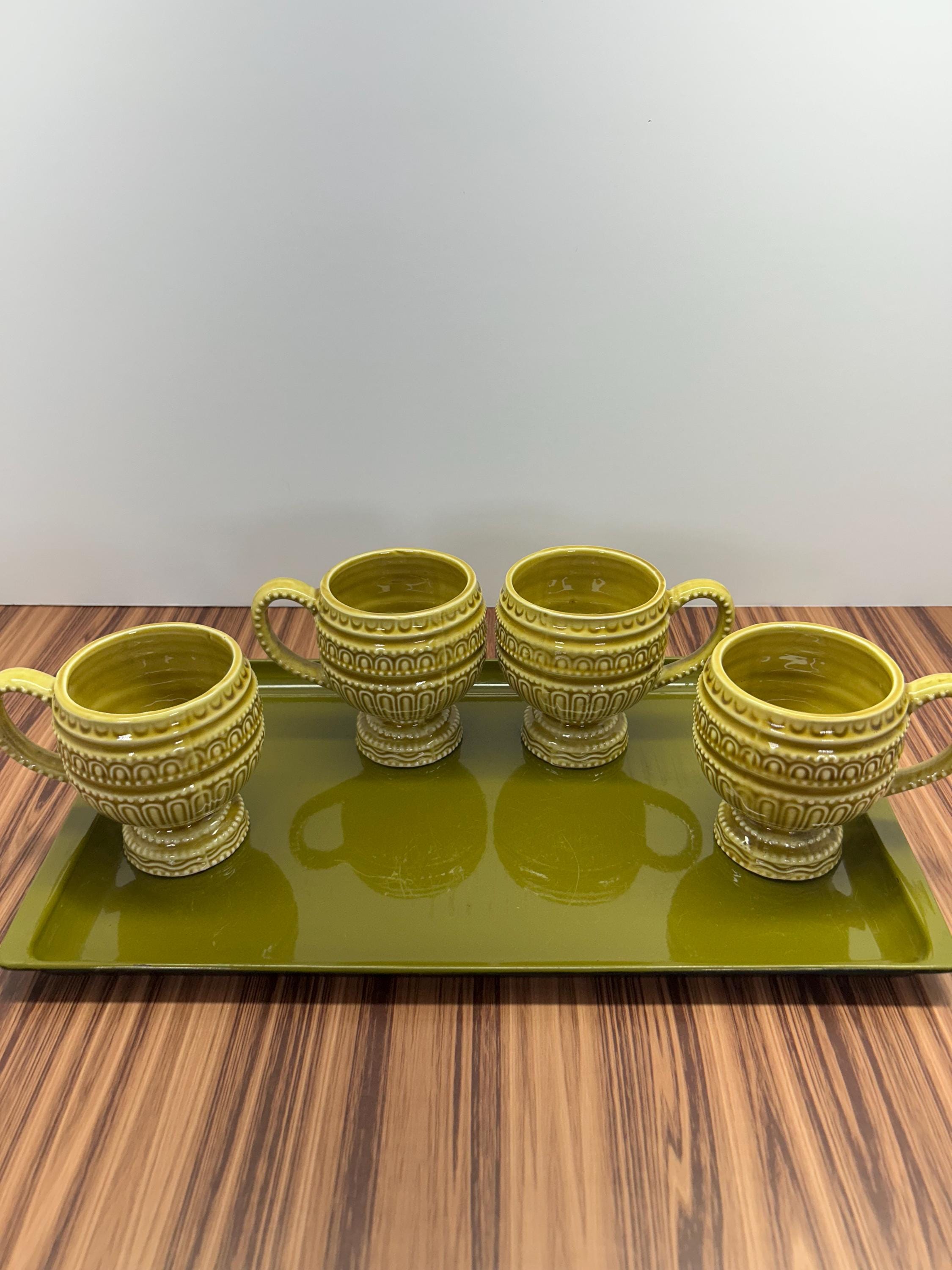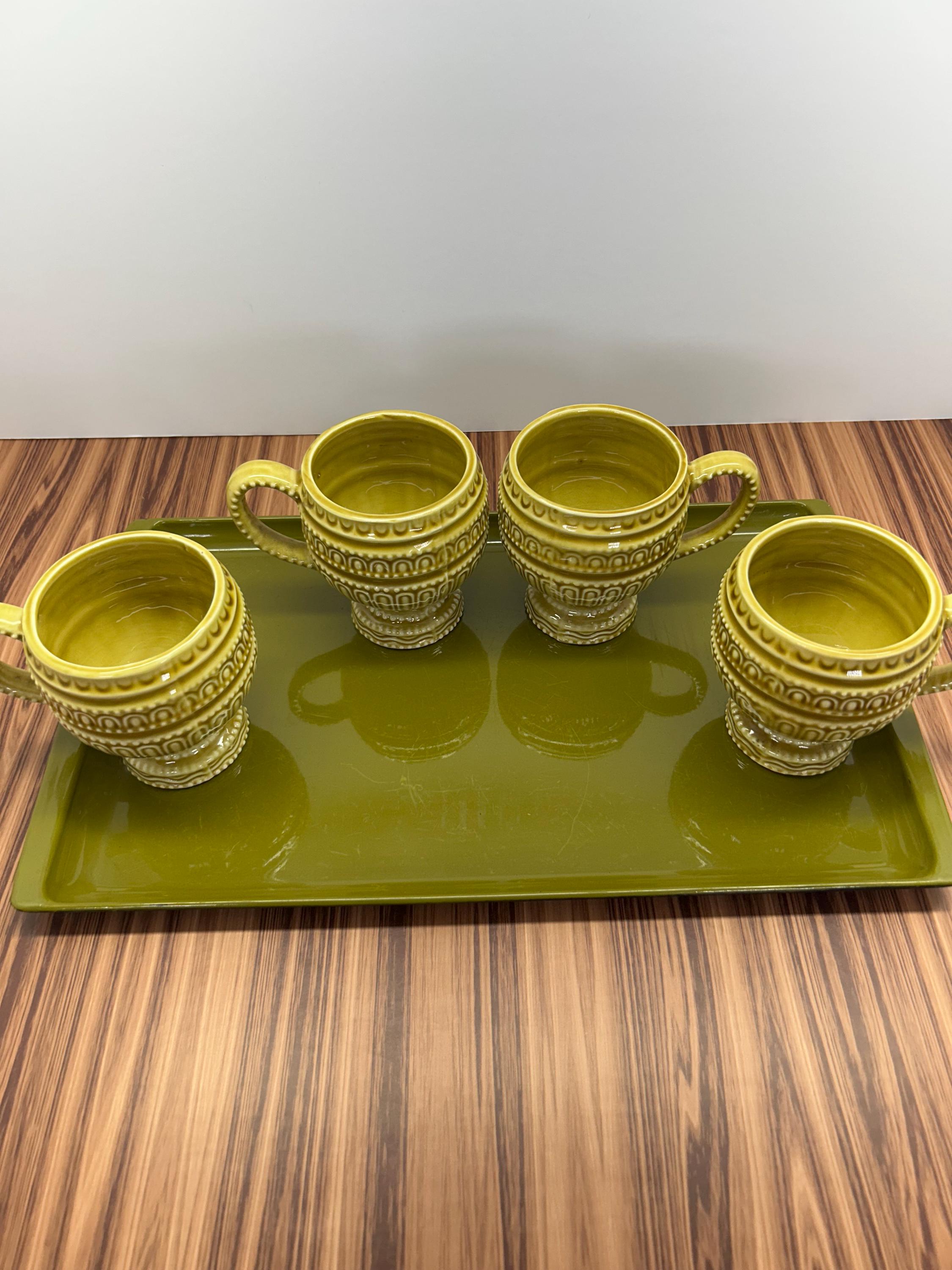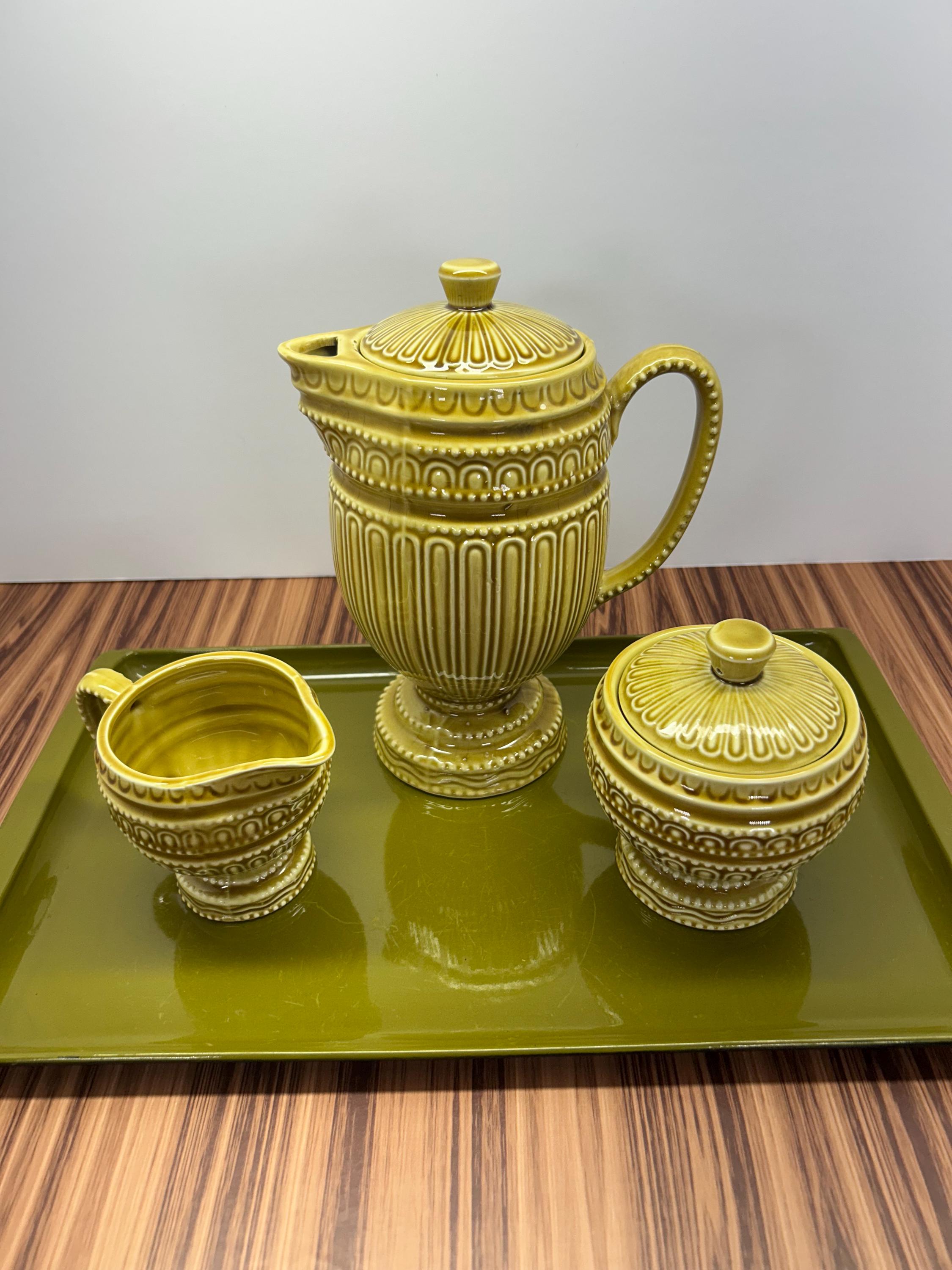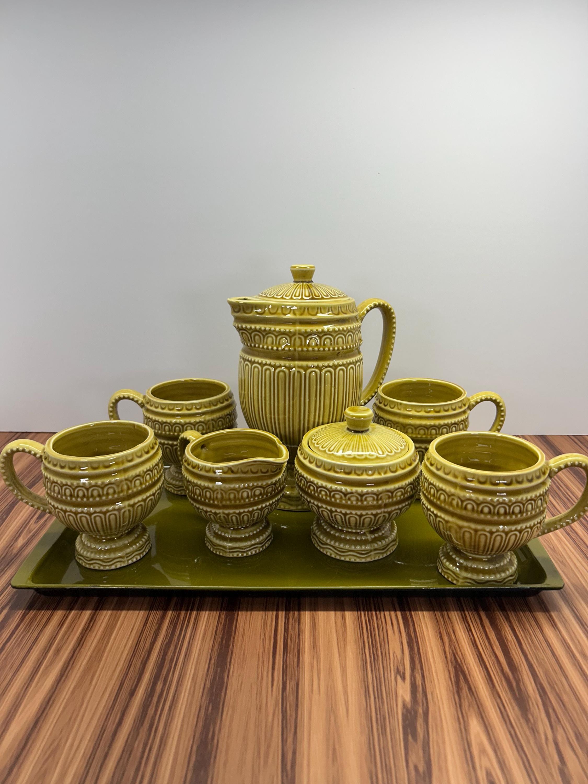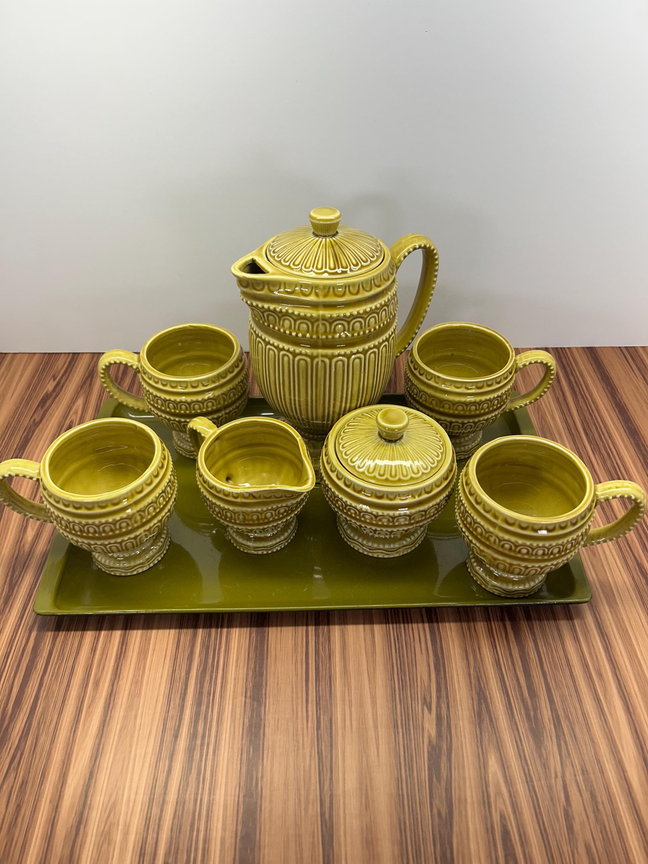 A stunning vintage Royal Sealy tea set from Japan in a beautiful harvest gold glaze. This complete ceramic set reflects the quality craftsmanship and understated elegance Royal Sealy is known for. Ideal for collectors or anyone who loves mid-century vintage tableware.