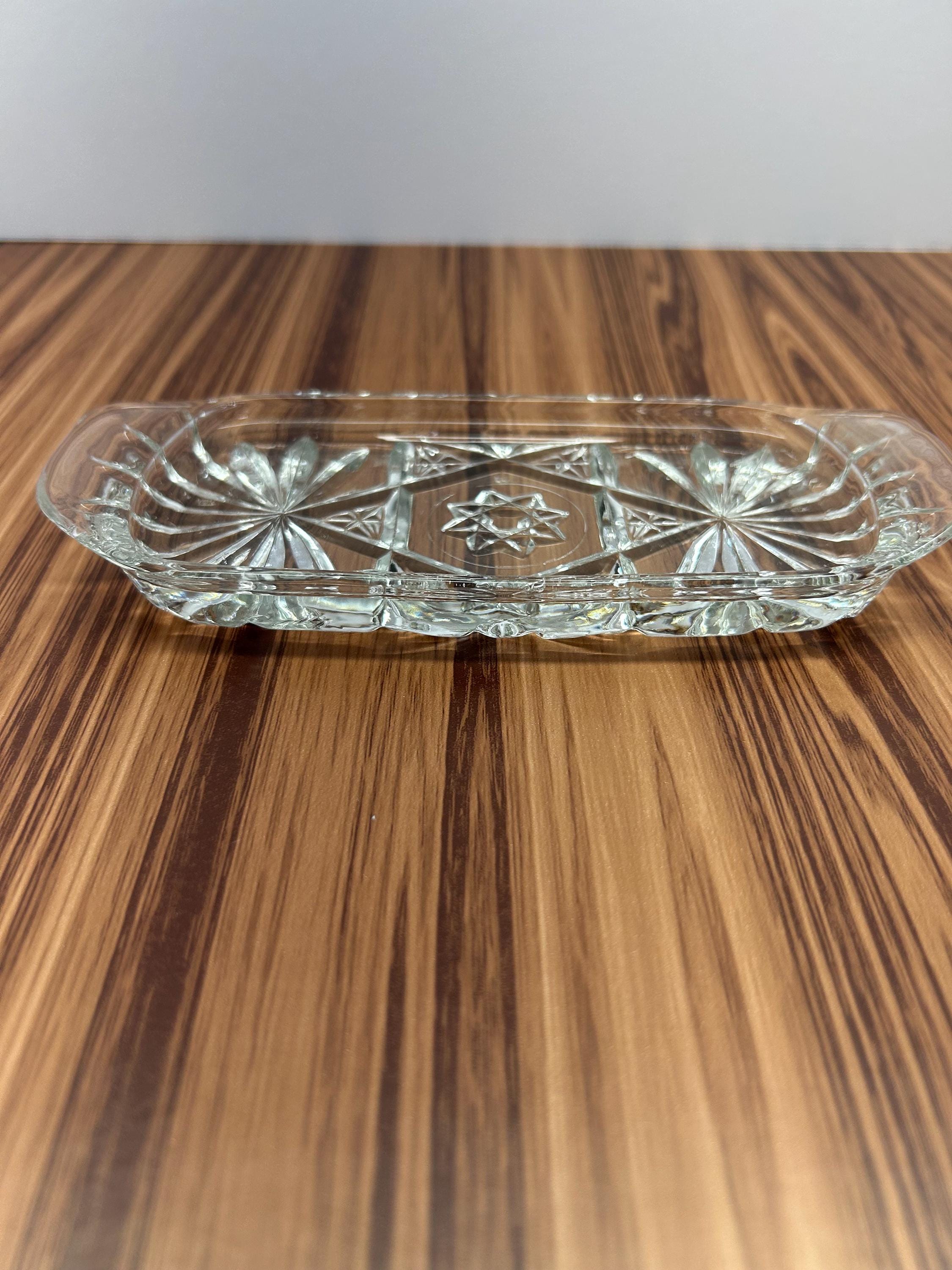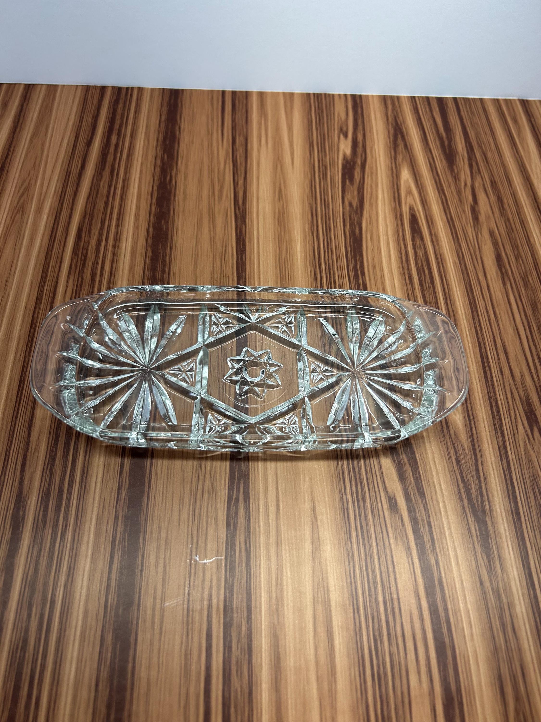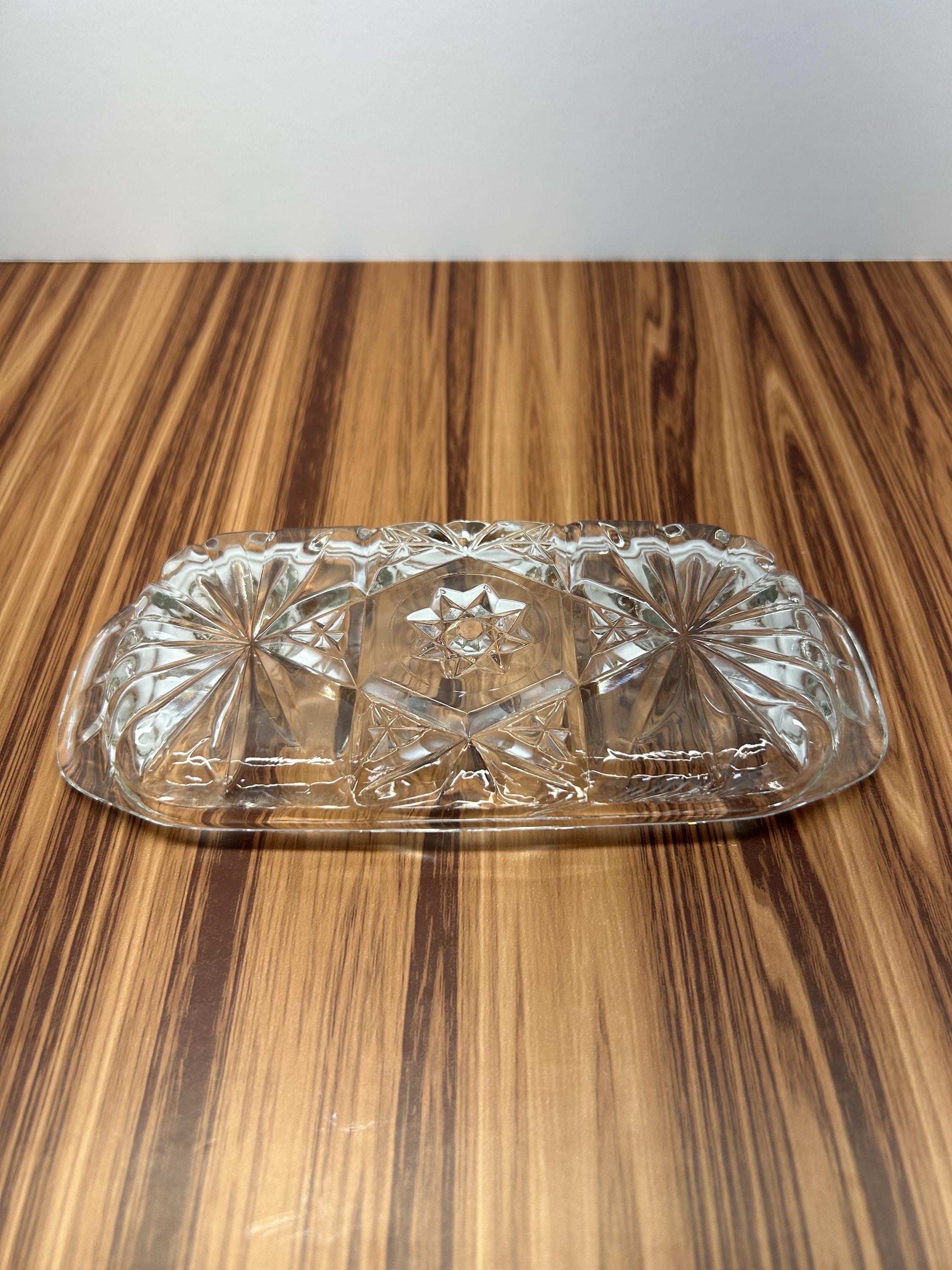 Vintage Anchor Hocking Early American Prescut glass butter dish base in the classic Star of David pattern. Made of clear pressed glass with sharp geometric detailing. This listing is for the bottom/base only (no lid). A great replacement piece or a beautiful small serving dish for collectibles or display.