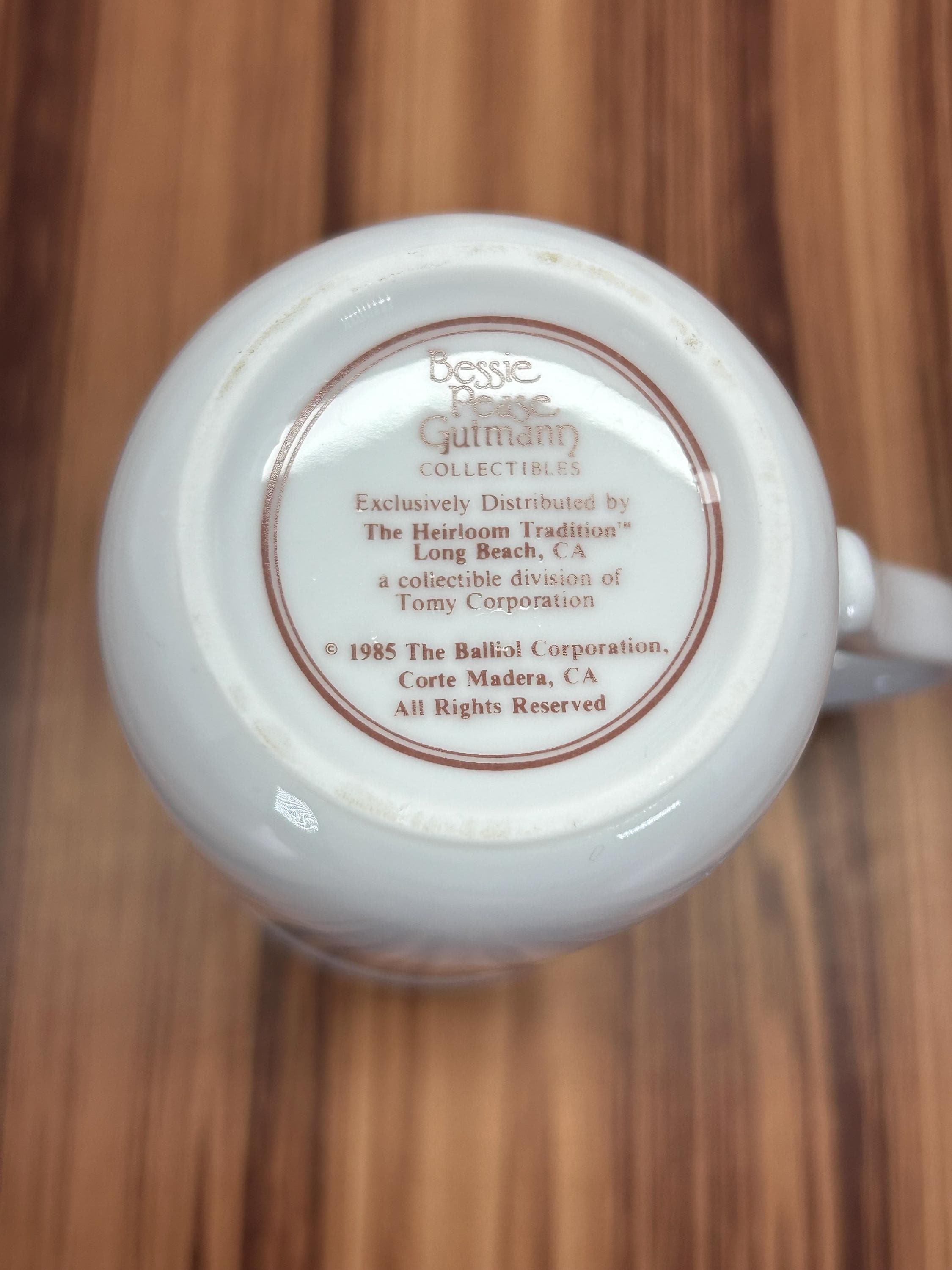 Vintage 1985 Bessie Pease Gutmann “Friendly Enemies” mug featuring her beloved sentimental child artwork. This collectible mug showcases the classic illustration style Gutmann is known for, making it a charming piece for collectors of vintage children’s art and Americana.