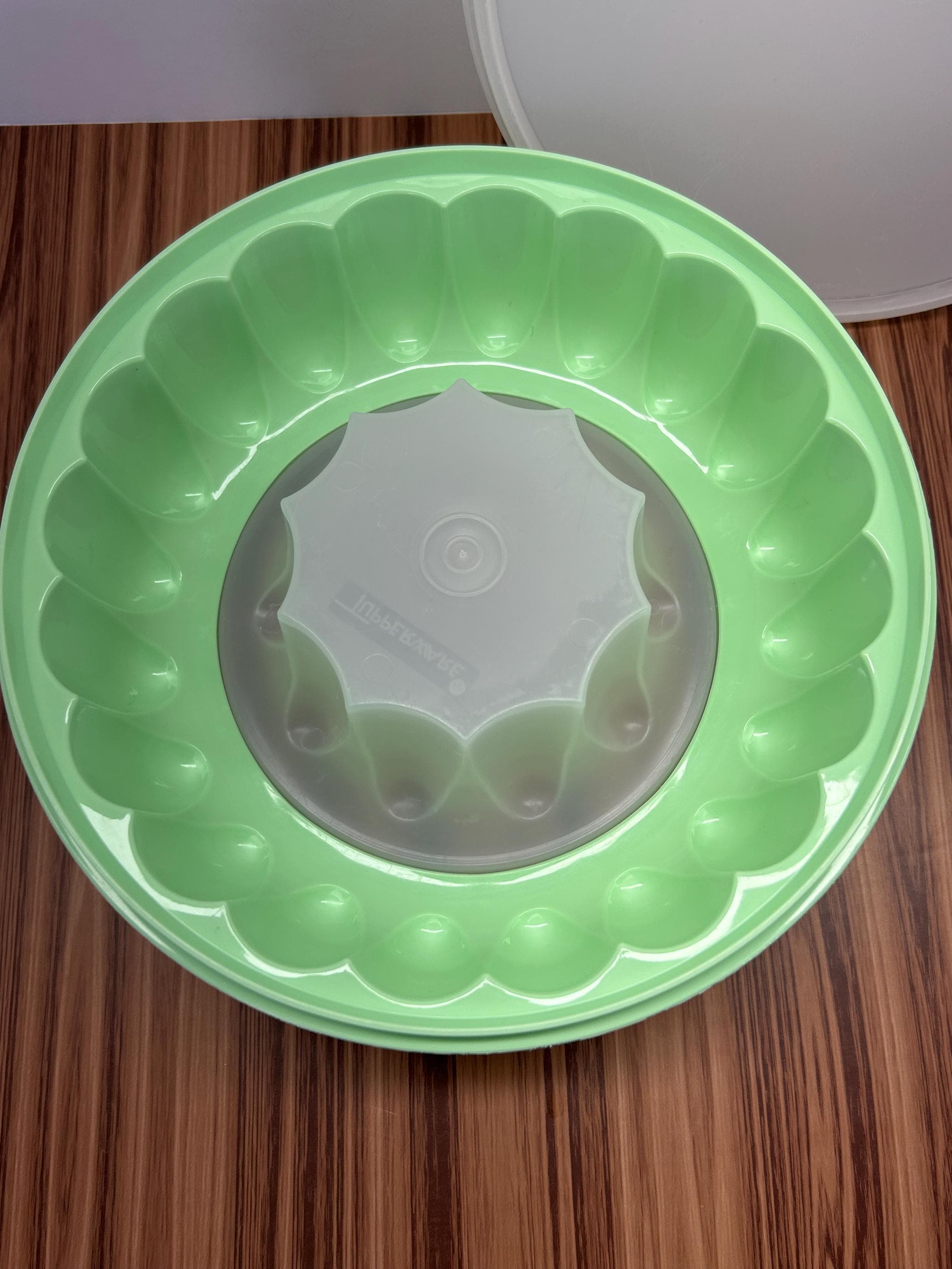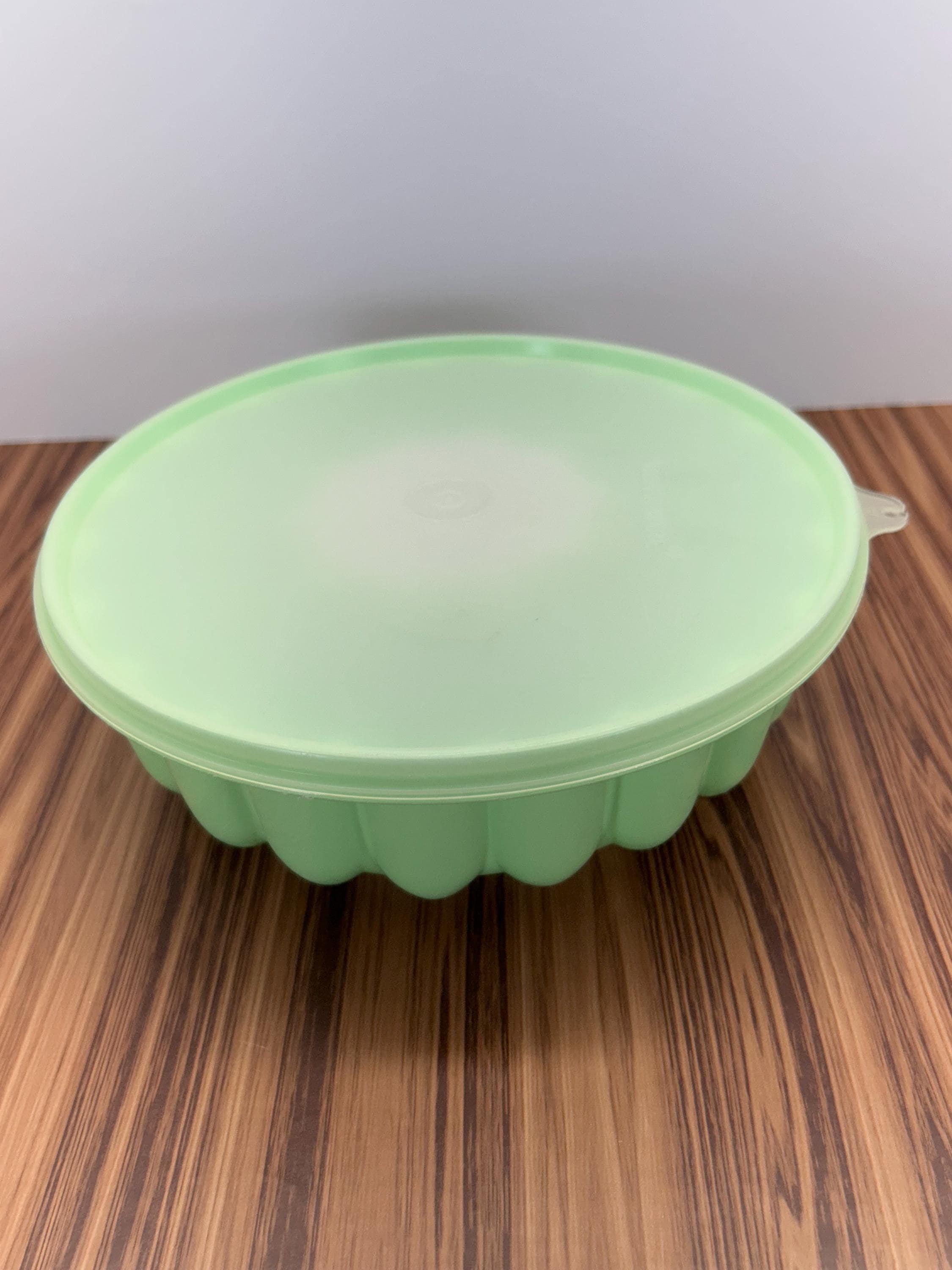 Vintage Tupperware Jello mold set in beautiful Jadite green, consisting of three pieces. Classic mid-century kitchenware known for durability and timeless design. Perfect for collectors of vintage Tupperware, retro kitchens, or nostalgic display.